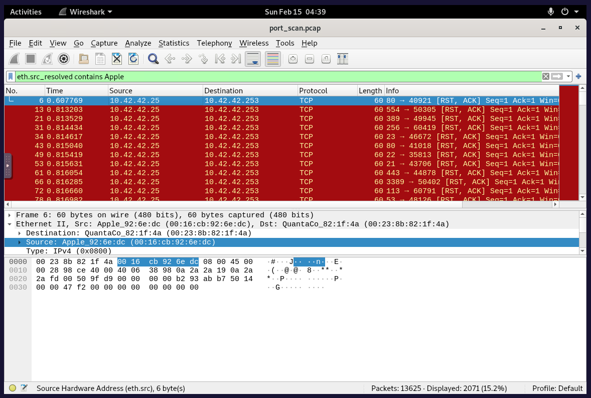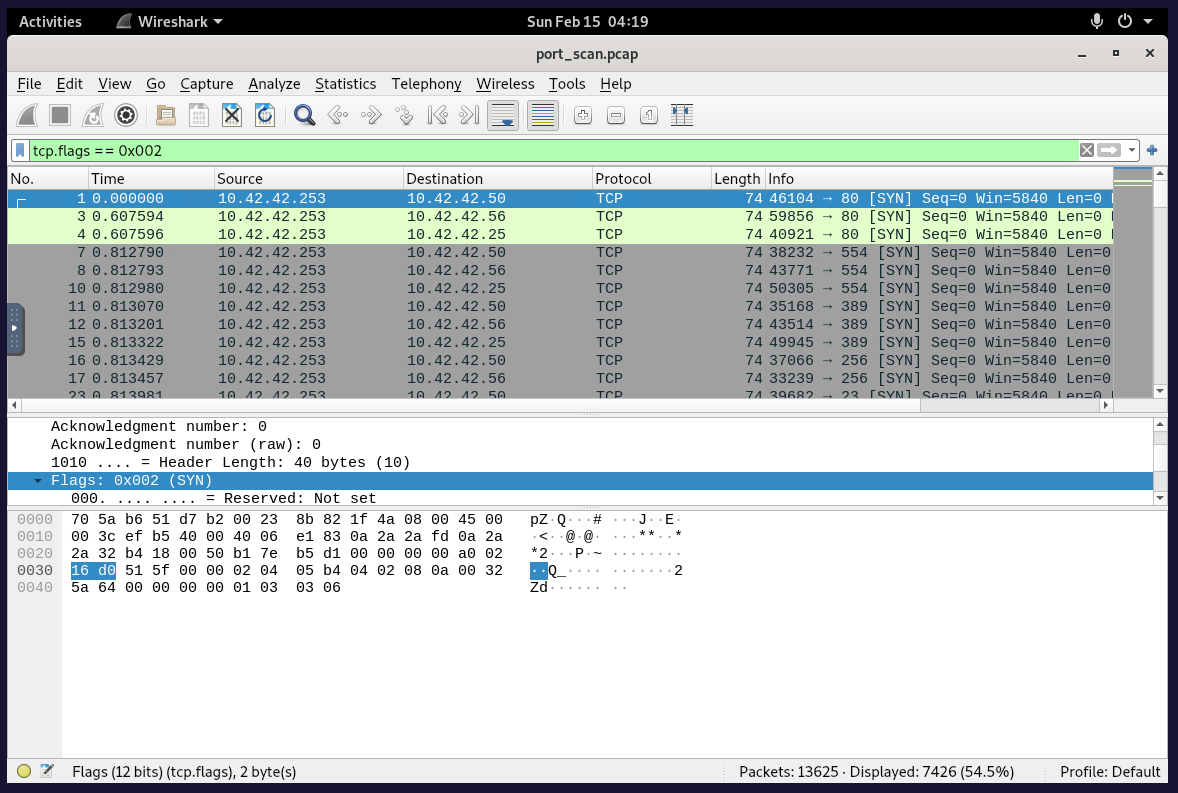 tcp.flags == 0x002- If we filter just for TCP SYN packets, we quickly get the answer: