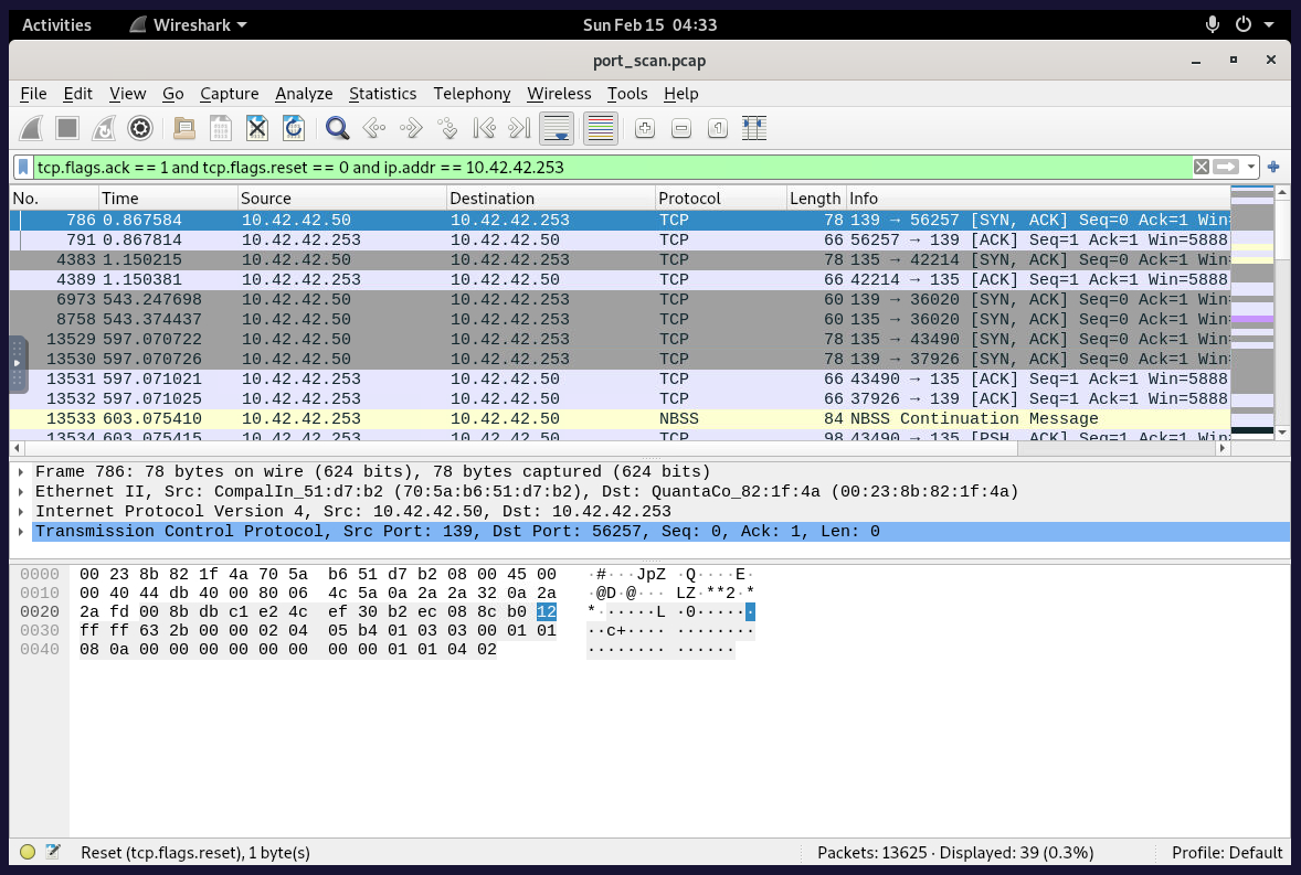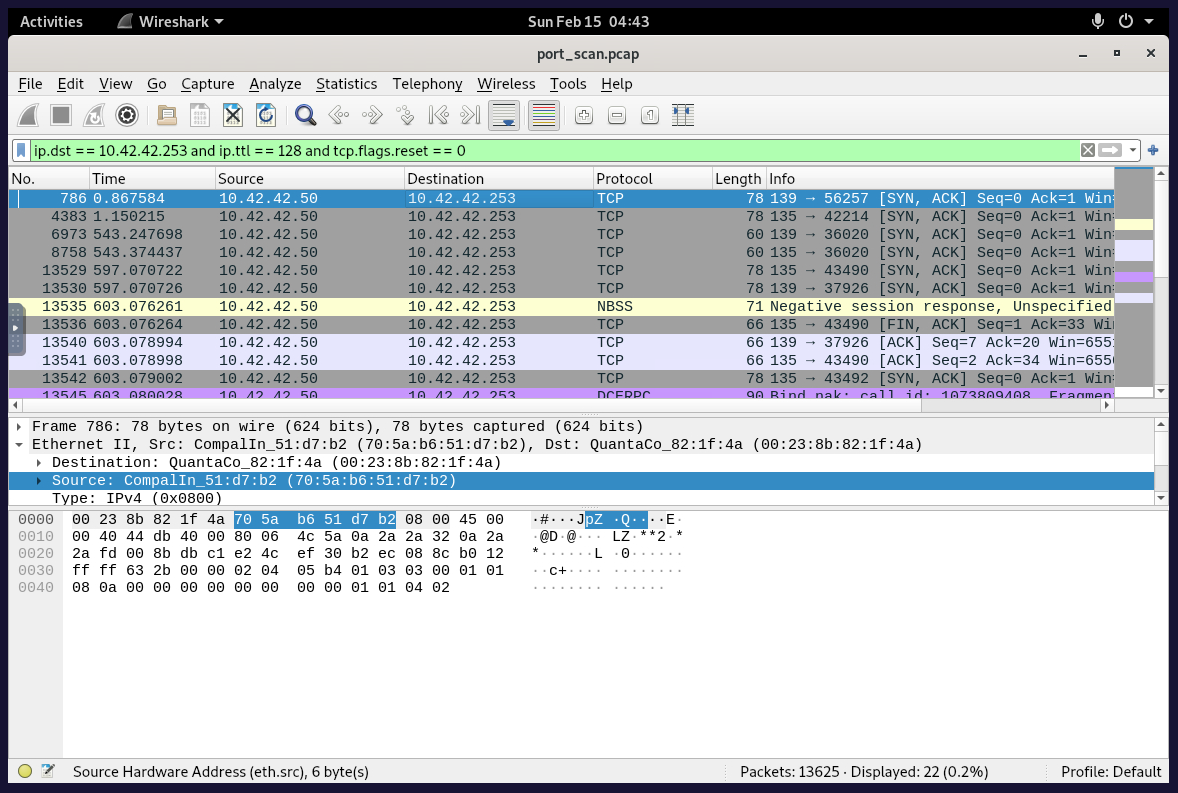 ip.dst == 10.42.42.253 and ip.ttl == 128 and tcp.flags.reset == 0- If we filter for computers talking back to the scanning computer, based on the IP packet time-to-live field being 128 (the value Windows machines tend to have), and ignore reset packets… We get the answer.