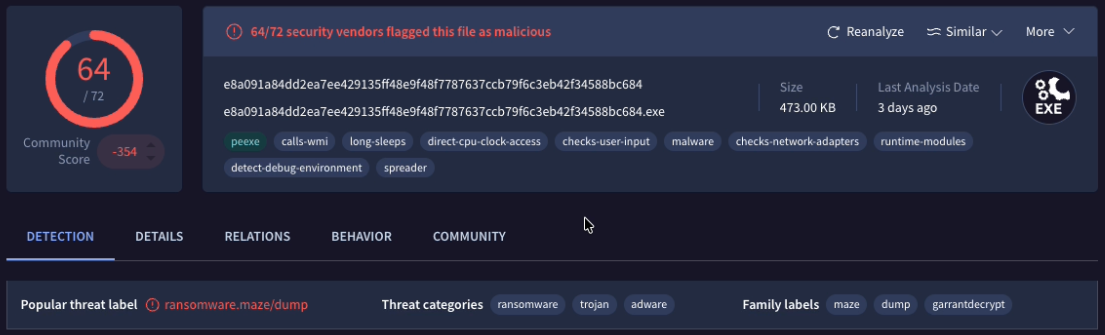 File verified via VirusTotal and Hybrid-Analysis to be Maze Ransomware.