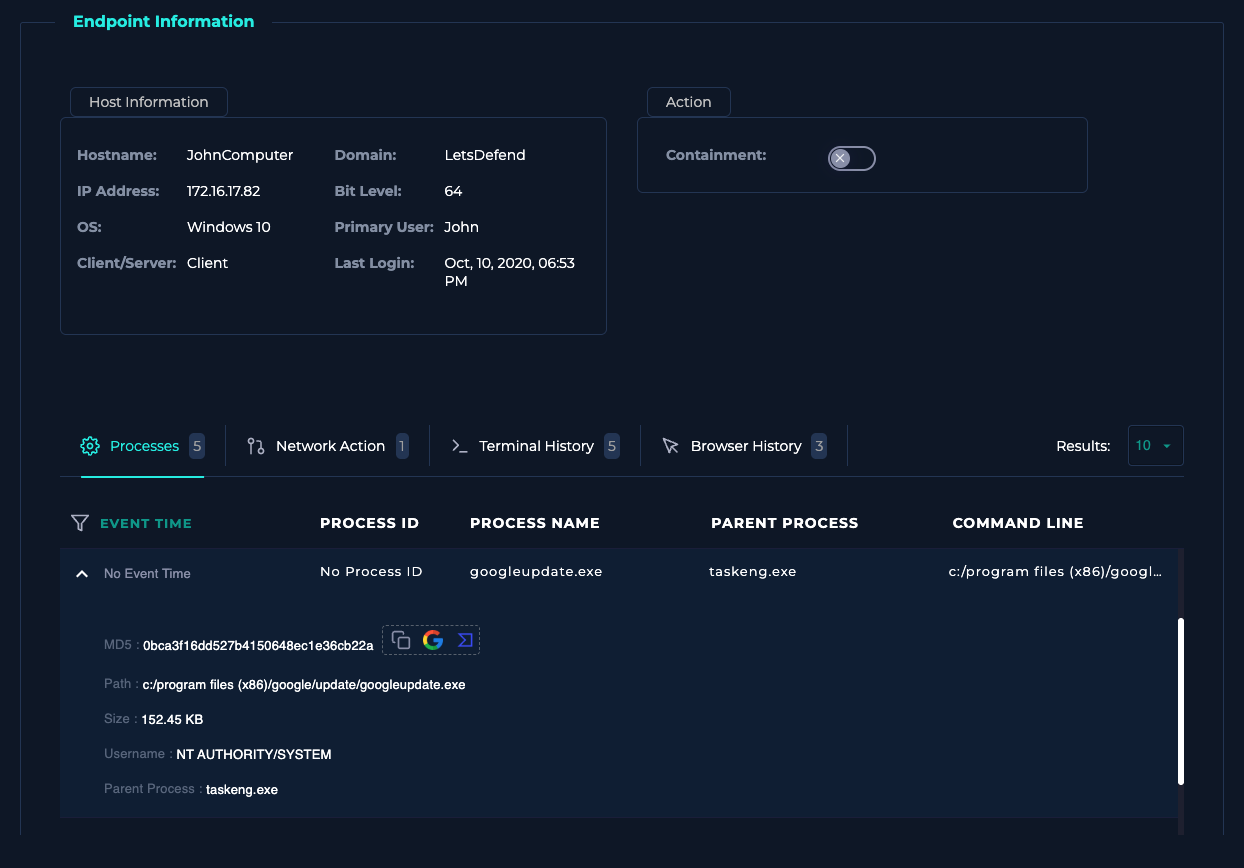 In the processes, you can see that GoogleUpdate.exe is indeed running, and the hash matches the alert.