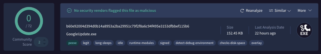 Oh, looks like we got the answer early. Binary is signed by Google, commonly scanned, and commonly flagged as okay, so it’s likely a false positive. Still gotta investigate though.