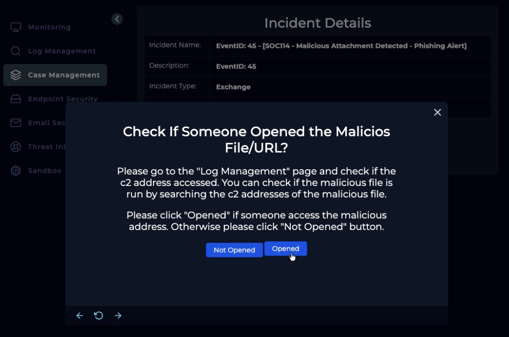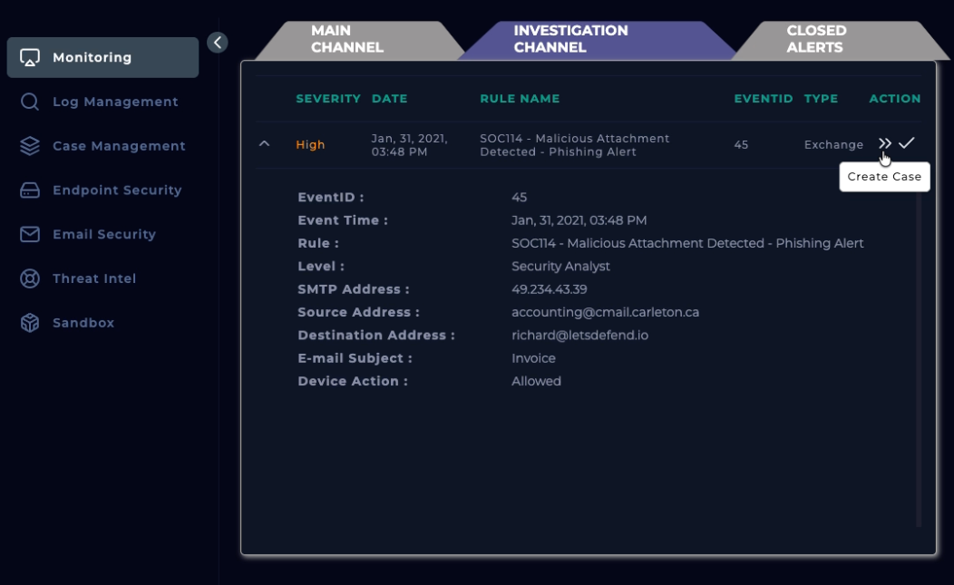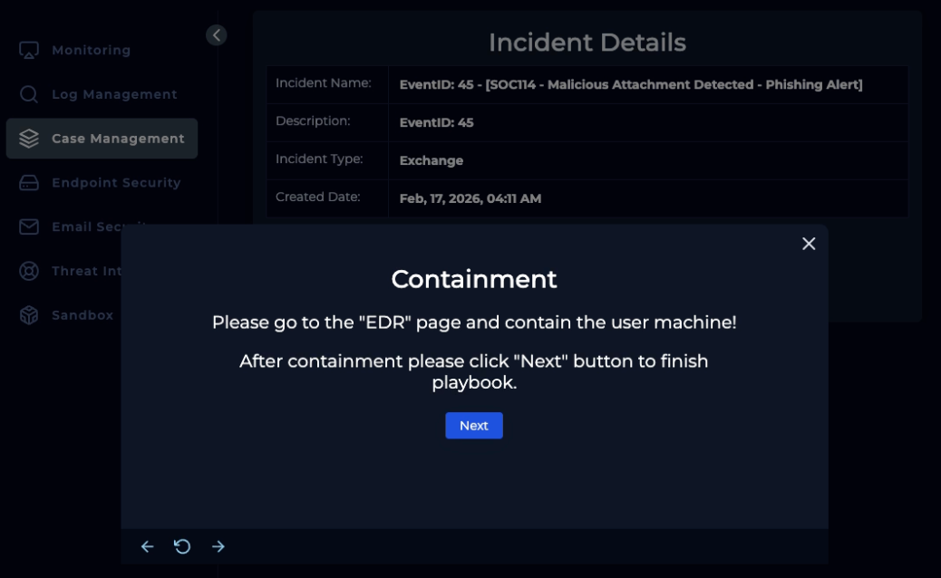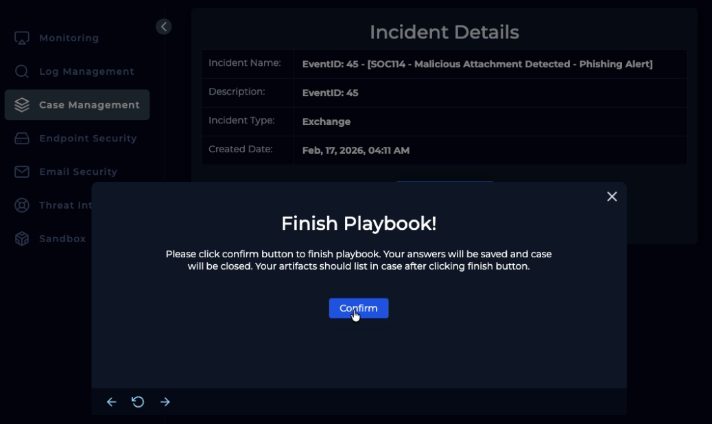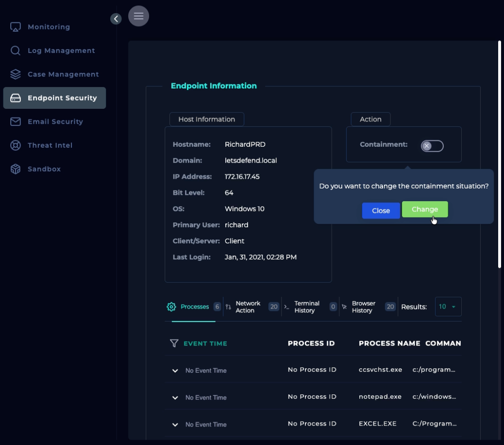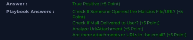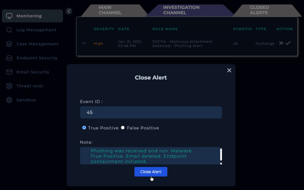 Alert finish; with note: “Phishing was received and run. Malware. True Positive. Email deleted. Endpoint containment initiated.”