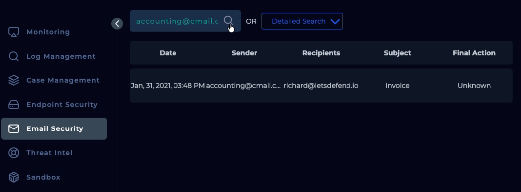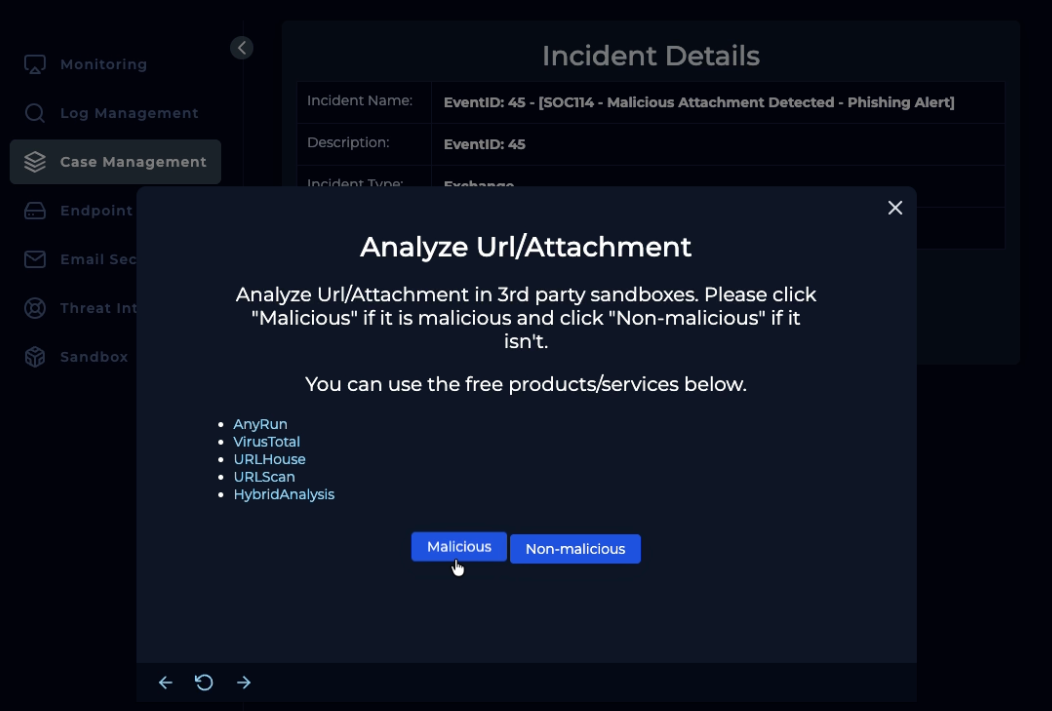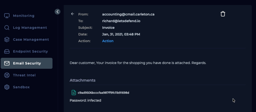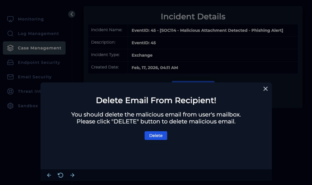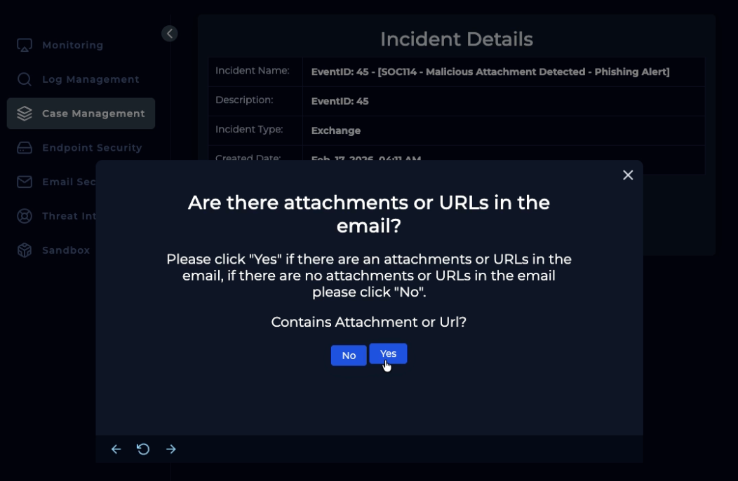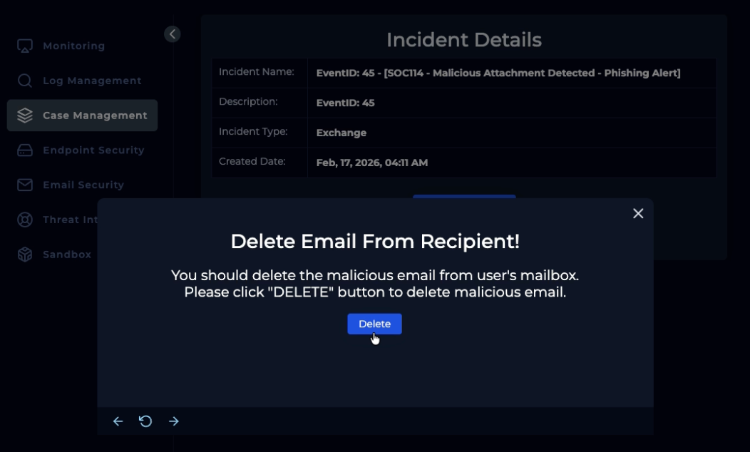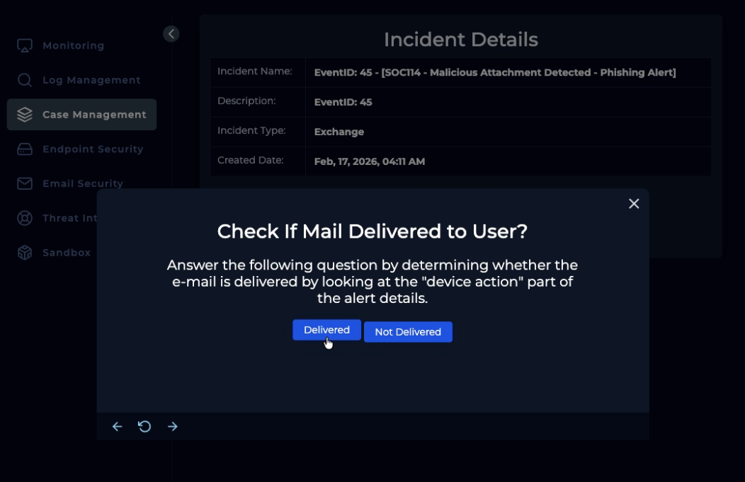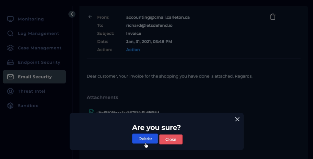Alert finish; with note: “Phishing was received and run. Malware. True Positive. Email deleted. Endpoint containment initiated.”