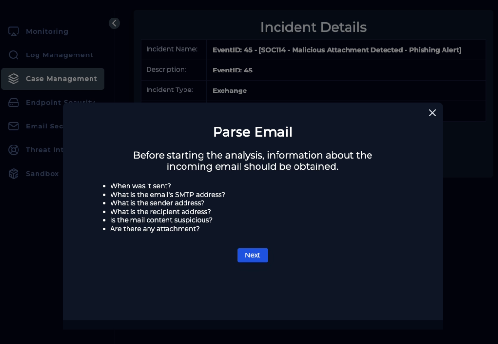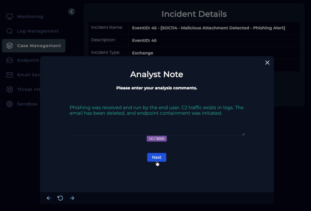 Quick analyst note: “Phishing was received and run by the end user. C2 traffic exists in logs. The email has been deleted, and the endpoint containment was initiated.”