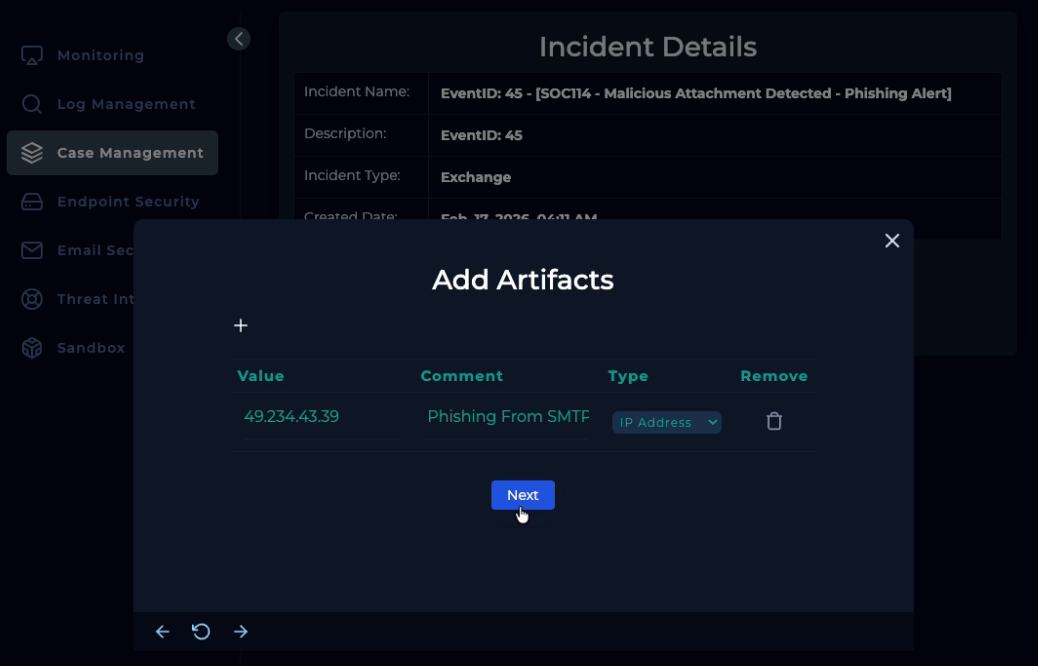 Added the IP of the SMTP server from which we received the phishing email. If we had more artifact locations, I’d add the phishing address and malware hashes, too.