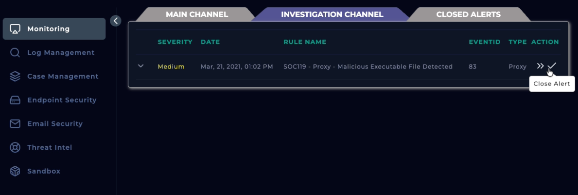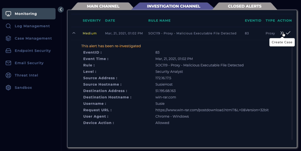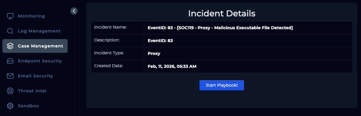 From the endpoint (filtering based on the alert event time), we get the same log. We can go back to the Case Management tab and continue with the playbook.